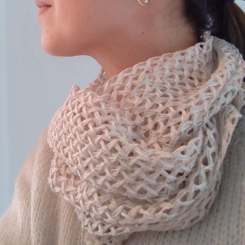なるほど。。細いリネン糸で編み方も可愛らしいのでササっと首に巻いて