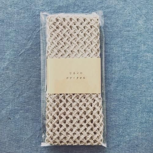 リネンと、とうもろこしから生まれたポリ乳酸繊維(とうもろこし繊維)のボディタオル。